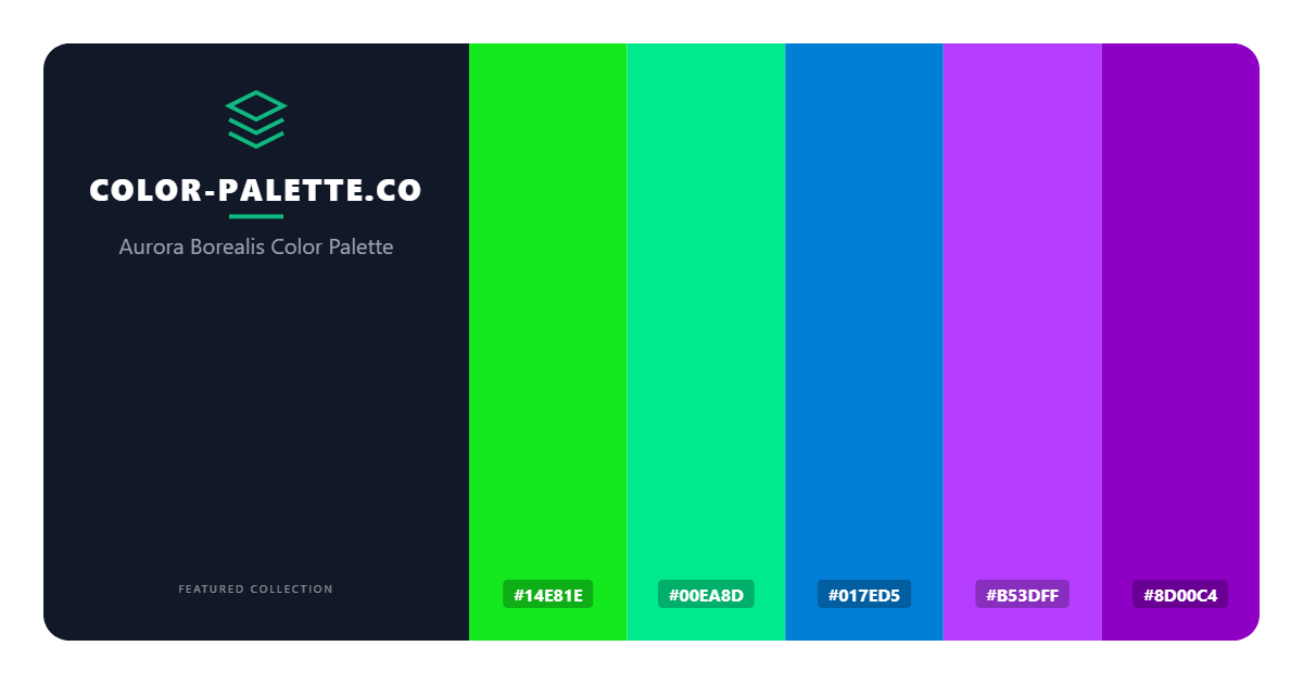 The Aurora Borealis color palette is a mesmerizing blend of vibrant hues that evoke the breathtaking beauty of the northern lights. This enchanting combination of colors has the power to captivate and inspire, transporting viewers to a world of wonder and magic. At its core, the palette is a masterful balance of cool and warm tones, with each shade working in harmony to create a truly unique and captivating visual experience. The palette’s energetic and modern feel makes it perfect for designers looking to add a touch of elegance and sophistication to their work.