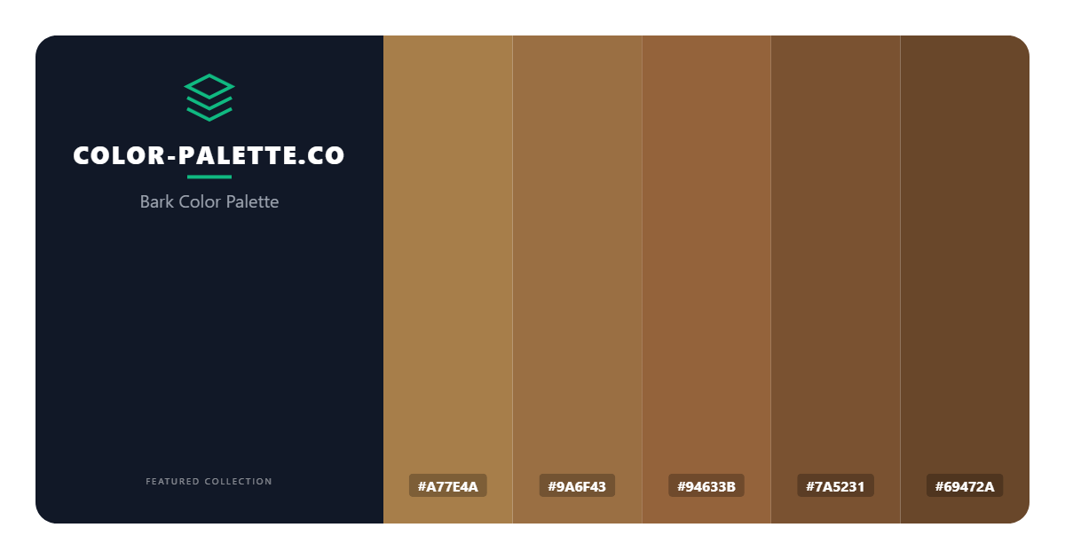 The Bark color palette is a warm and inviting collection of earthy tones that evoke feelings of comfort and stability. At its core, this monochromatic palette is all about creating a sense of balance and harmony, drawing inspiration from the natural world to bring a sense of warmth and coziness to any design. The palette’s vintage vibe is reminiscent of worn leather and weathered wood, giving it a unique character that is both nostalgic and timeless.