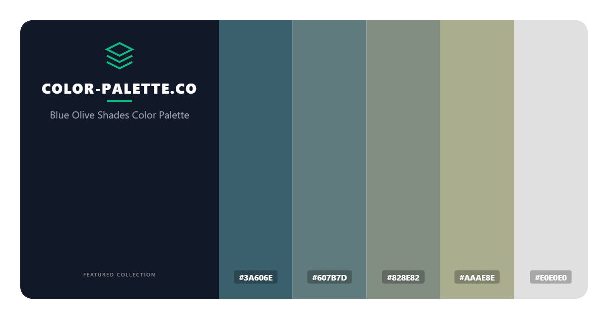 The Blue Olive Shades palette is particularly well-suited for use in website design, app development, and corporate branding, where a professional and calming visual identity is essential. Designers can use this palette to create a sense of trust and stability, while also conveying a sense of innovation and forward thinking. In marketing materials, this palette can be used to create a sense of cohesion and consistency, tying together disparate elements and creating a strong visual brand identity. Whether used in digital or print applications, the Blue Olive Shades palette is sure to create a lasting impression on viewers.