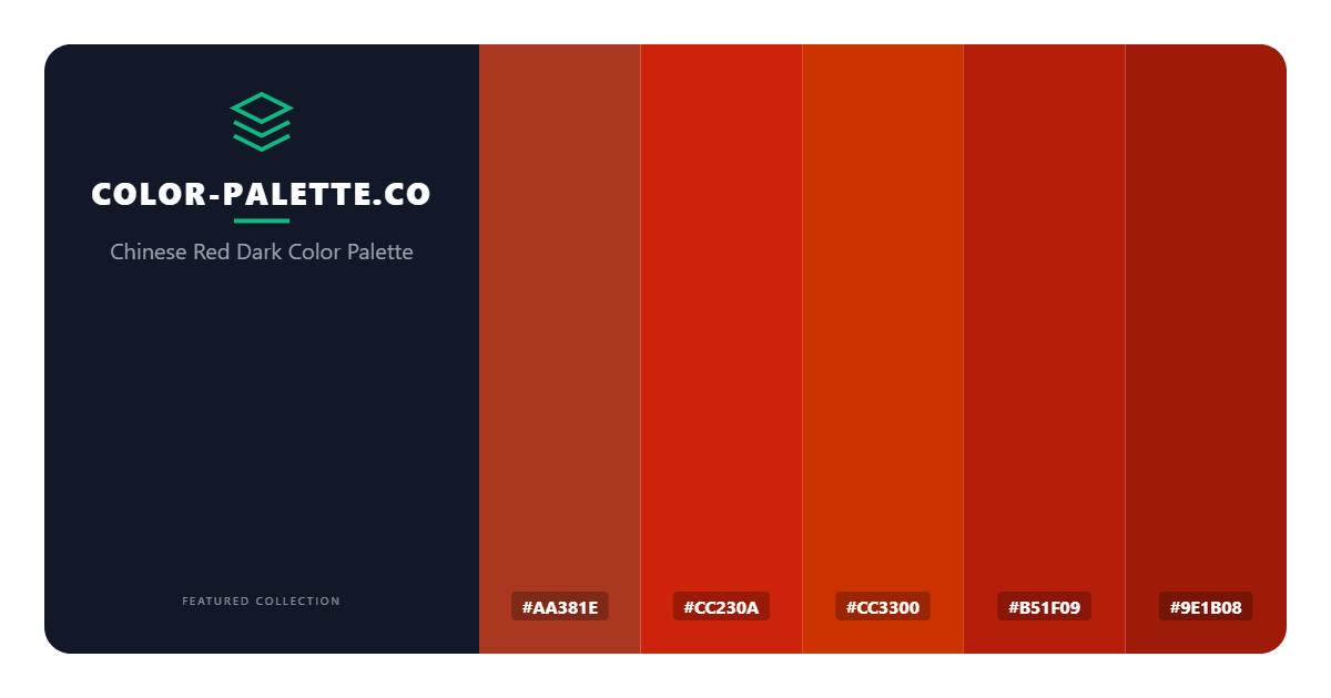 The Chinese Red Dark color palette is a masterful blend of deep, rich hues that evoke a sense of energy, passion, and sophistication. This monochromatic palette, with its varying shades of red and maroon, is sure to capture the viewer’s attention and leave a lasting impression. At its core, the palette features a range of bold, vibrant colors, including the dark, cool tone of AA381E, which serves as a dramatic anchor for the entire palette. This shade is perfectly balanced by the warm, inviting tone of CC230A, a bright, fire engine red that adds a sense of excitement and urgency to the overall design.