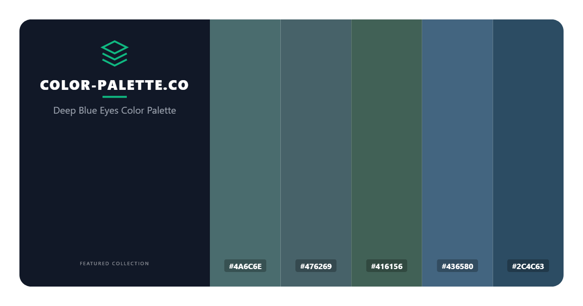 The Deep Blue Eyes color palette is a captivating and emotive collection of blues that evoke feelings of serenity, trust, and wisdom. At its core, this palette is a masterful blend of monochromatic hues that transport the viewer to a realm of calmness and professionalism, making it perfect for designs that require a sense of sophistication and elegance. The palette’s cool and vintage undertones also bring to mind the soothing ambiance of a coastal sky at dusk, with the gentle blend of blue, turquoise, sage, and navy shades that seem to dance across the horizon.