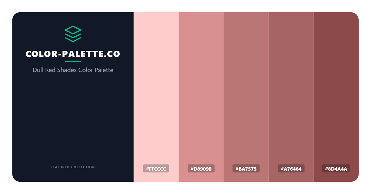 The Dull Red Shades palette is incredibly versatile, lending itself to a wide range of practical applications, from website design and app development to branding and marketing materials. Designers can use this palette to create a cohesive visual identity for a company or product, with the warm, inviting tones evoking feelings of comfort and approachability. The palette’s balanced, modern aesthetic also makes it an excellent choice for digital products, such as mobile apps or social media platforms, where a clean and intuitive design is essential. Additionally, the coral and pink undertones in the palette make it an excellent choice for designs targeting a female audience, or for products and services related to beauty, wellness, or lifestyle.