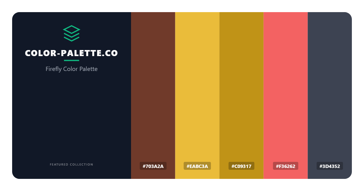 Delving deeper into the individual colors that comprise the Firefly palette, we find a complex interplay of shades and tones that add depth and nuance to the overall design. The warm, earthy tone of the color eabc3a provides a sense of comfort and familiarity, while the deep, cool tone of the color 3d4352 adds a sense of sophistication and elegance. The vibrant, energetic shade of f36262 injects a sense of playfulness and creativity, balanced by the more subdued, natural tone of c09317. Meanwhile, the rich, earthy tone of 703a2a serves as a grounding force, tying the entire palette together and preventing it from feeling too bright or overwhelming. Each of these colors plays a vital role in the overall aesthetic of the Firefly palette, working together to create a sense of warmth, energy, and refinement.
