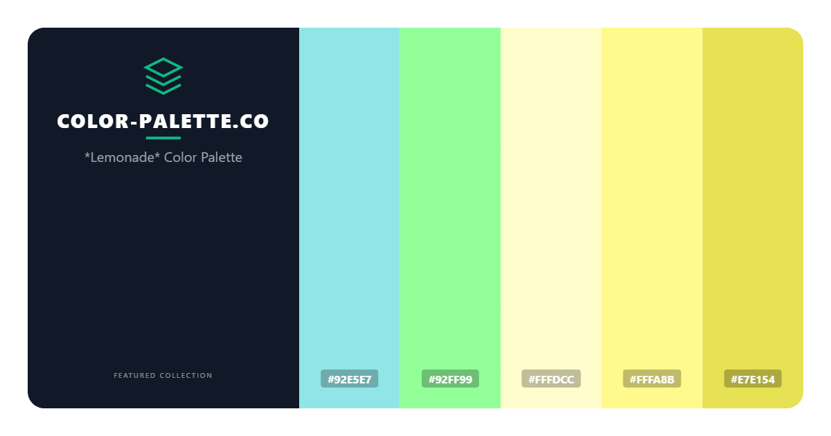 The Lemonade color palette is a refreshing and uplifting collection of hues that evoke the feeling of a warm spring day, filled with vibrant energy and a sense of optimism. This palette has the power to transport viewers to a place of happiness and serenity, making it an ideal choice for designers looking to create a lasting impression. At its core, the Lemonade palette is a masterful blend of soft pastels and bold brights, with a unique fusion of cyan, yellow, and green tones that work together in perfect harmony.