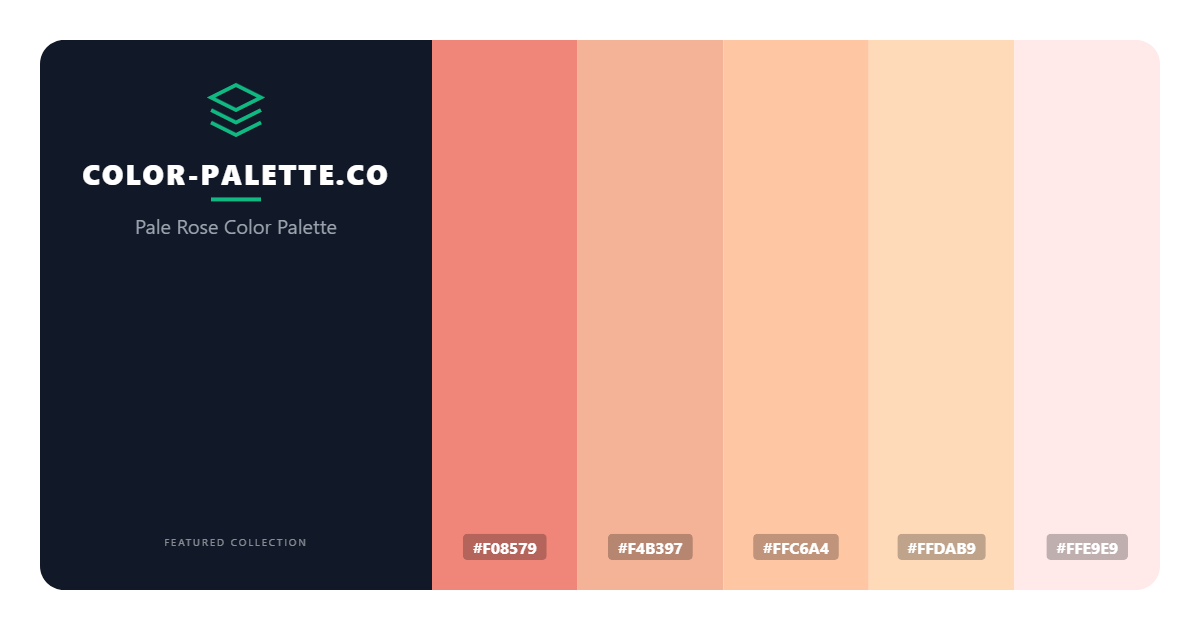 The Pale Rose color palette is a delicate and enchanting combination of hues that evoke a sense of warmth and serenity, transporting us to a world of gentle beauty and subtle elegance. This monochromatic palette, dominated by shades of red, is perfect for designers seeking to create a light, airy, and vibrant atmosphere in their work. The palette’s soothing quality is due in part to the gentle progression from F08579, a soft blush tone, through F4B397, a slightly deeper and richer shade, to the pale and delicate FFC6A4, which adds a touch of warmth and coziness to the overall palette.