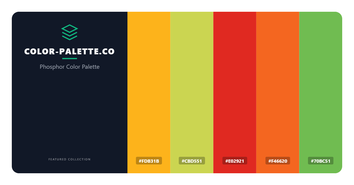 Delving deeper into the palette, we find that the warm, golden shade of FDB31B serves as a foundational element, providing a sense of comfort and familiarity. This inviting color is perfectly balanced by the soft, muted tone of CBD551, which adds a touch of sophistication and elegance to the overall design. The bold, fiery hue of E02921 injects a sense of passion and energy, while the deep, burnt orange of F46620 adds a sense of depth and richness. Meanwhile, the muted, sage green of 70BC51 provides a soothing contrast, grounding the palette and preventing it from feeling too overwhelming. Each of these colors plays a vital role in creating a sense of harmony and balance, making the Phosphor palette a versatile and effective choice for a wide range of design applications.