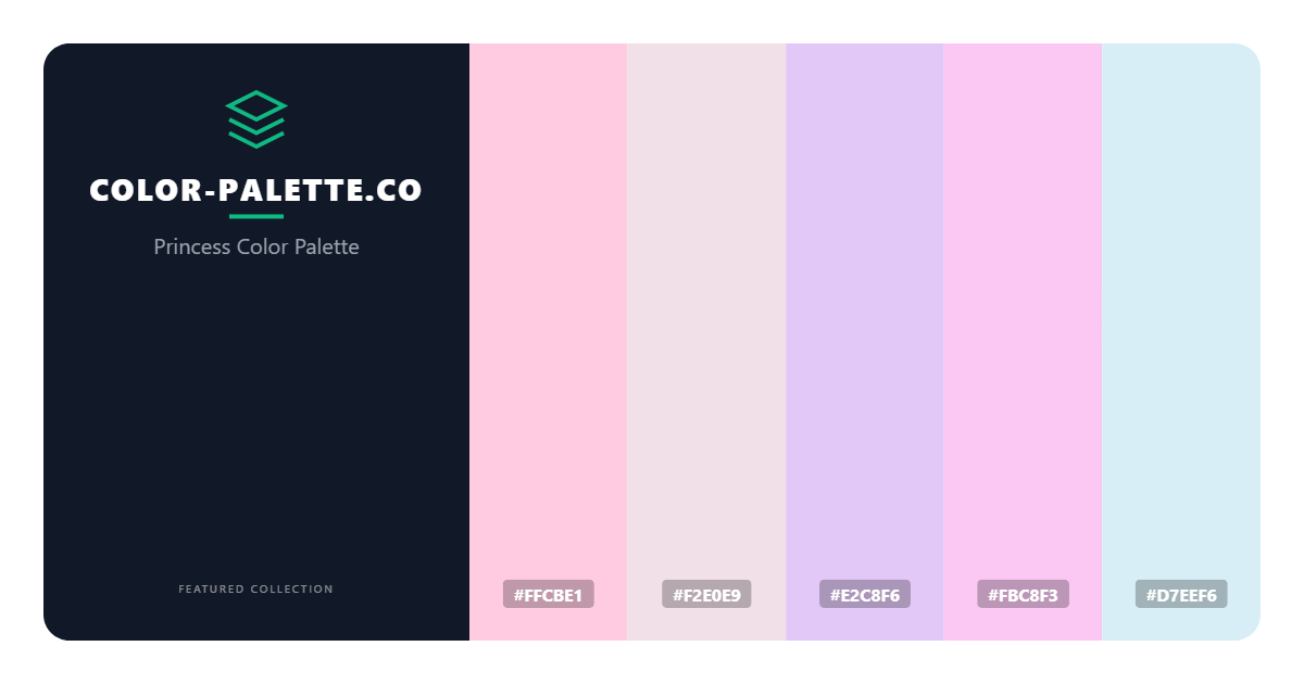 The Princess color palette is a delicate and enchanting combination of hues that evoke feelings of elegance and refinement, transporting viewers to a world of fairy tales and romance. This palette is characterized by soft, pastel shades that blend seamlessly together to create a sense of harmony and balance, perfect for designs that require a touch of femininity and sophistication. At the heart of this palette lies a range of colors that work in concert to create a sense of warmth and approachability, from the gentle FFCBE1, a pale pink with a hint of peach, to the soothing F2E0E9, a soft blush tone that adds a touch of subtlety and nuance.