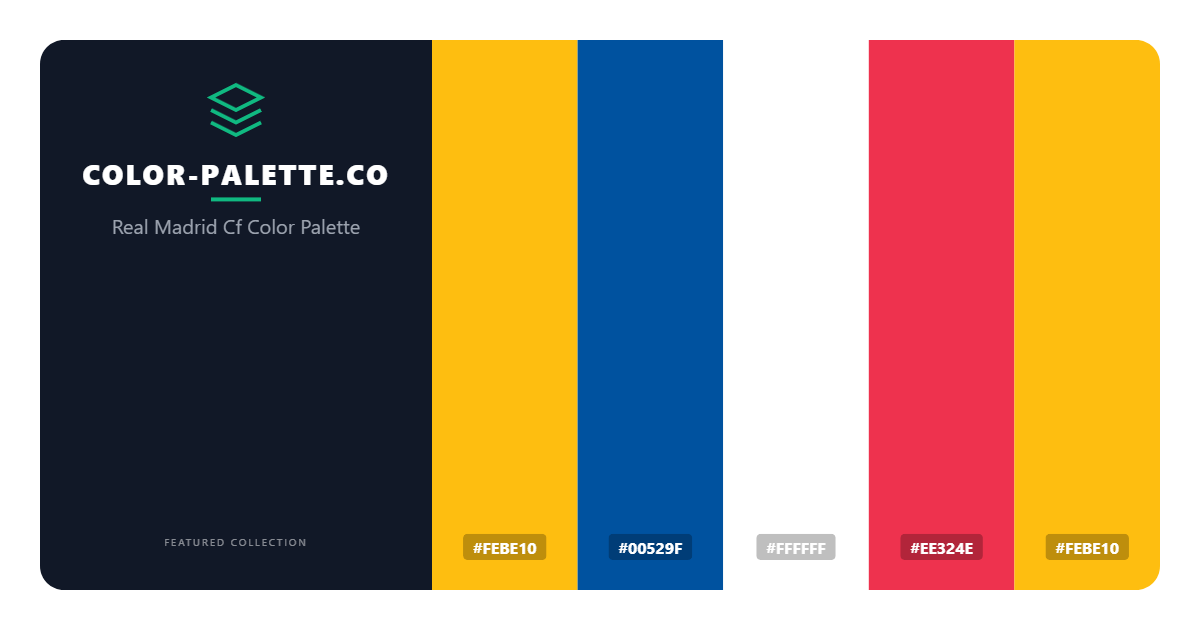 The Real Madrid Cf color palette is an electrifying fusion of warm and vibrant hues that exudes energy, passion, and playfulness, evoking the spirit of one of the world’s most renowned football clubs. At its core, this palette is designed to captivate and inspire, making it an ideal choice for designers seeking to create a bold and modern visual identity. The carefully curated selection of colors, including the eye-catching febe10, the deep and rich 00529f, the crisp and clean white, the bold and dynamic ee324e, and the repeated use of febe10, work together in perfect harmony to create a truly unique and captivating visual experience.