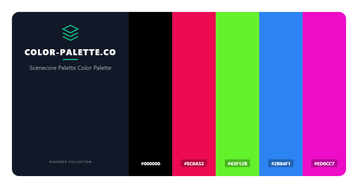 The Scenecore Palette is a vibrant and dynamic collection of colors that evokes a sense of energy and playfulness, making it perfect for modern designs that aim to capture attention and evoke emotion. At its core, this palette is all about creating a visual experience that is both bold and harmonious, with a careful balance of contrasting hues that work together to create a truly unique aesthetic. From the deep, mysterious tone of the darkest color, ec0a52’s complementary opposite, a pure black, sets the stage for a dramatic and engaging visual narrative.