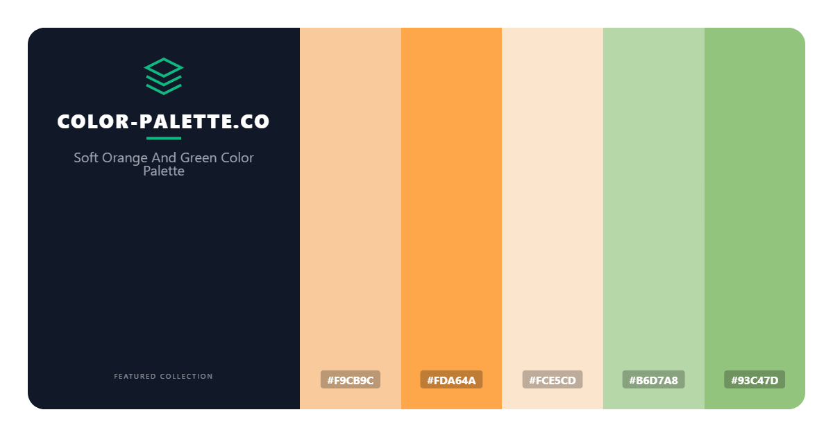 At the heart of this palette is F9CB9C, a soft and creamy orange shade that sets the tone for the entire color scheme. This shade is perfectly complemented by FDA64A, a slightly deeper and more vibrant orange hue that adds a touch of warmth and energy to the palette. FCE5CD, a pale and gentle orange-beige shade, provides a subtle contrast to the bolder orange tones, while B6D7A8, a muted greenish-gray shade, adds a sense of calmness and serenity to the palette. Finally, 93C47D, a fresh and soft mint green shade, brings a cool and refreshing touch to the palette, rounding out the color scheme with a sense of natural balance.