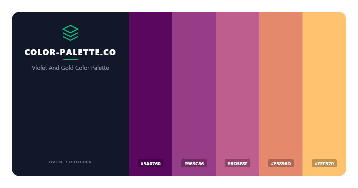 The Violet And Gold color palette is a captivating combination of rich, jewel-toned hues that evoke a sense of luxury and sophistication, while also exuding a playful and feminine charm. At its core, this palette is designed to evoke emotions and inspire creativity, making it perfect for designers and developers looking to add a touch of elegance and whimsy to their projects. The palette’s unique blend of violet, gray, orange, and plum tones creates a sense of depth and visual interest, drawing the viewer in and inviting them to explore.